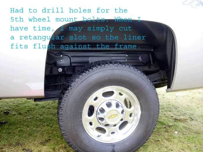 Well, thanks to raengines and Greatbear, I installed the wheel house liners on my 2007.5. Did have a little problem with the 5th wheel mounting brackets that bolt to the frame but it still looks better than stock. I am not very "mechanical minded" so I took a bunch of pictures in case there are readers like me! Took me a little more than an hour...instructions say only 30 minutes!
