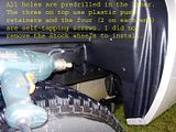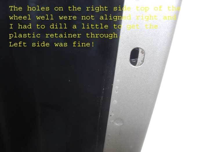 There are 4 small, wax-coated self-drilling/tapping screws for each side, plus three push pins. The push pins are along the top edge of the wheel opening, the holes are already in the sheetmetal and in the liners. If you look carefully in the pics (especially the first one), you can see the bolts, there are two on each bottom edge roughly above the leaf springs. The holes are predrilled in the liners, just spin the bolts with a drill-mounted 5/16 socket.